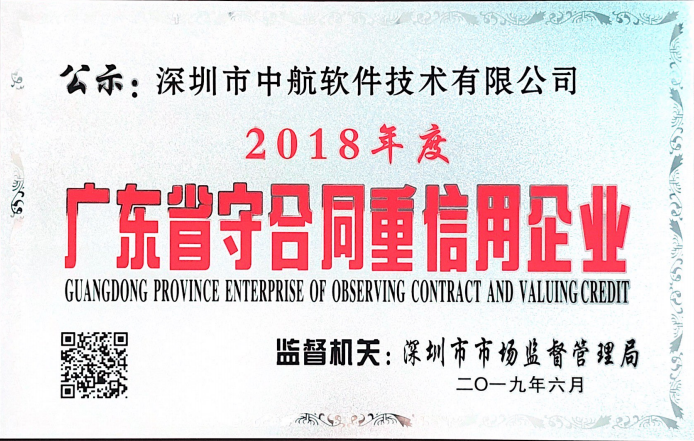 近期我司收到深圳市市场监督管理局的通知,经过严格的资质审核和信用评审,我司已经通过各项审核,获评2018年度广东省“守合同重信用”企业,并为我司颁发了证书及荣誉牌匾。本次评选工作中,中航信息为连续两年获评该荣誉,中航软件为首次获评。