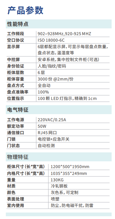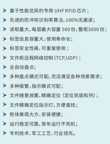 智能⽂件柜利⽤ RFID 技术能对⽂件柜内部带有RFID 标签的⽂件档案进⾏ 睠睟睟%的准确识别;符合远程或⾃动盘点, 电动开⻔,异常报警,⽂件档案位置指⽰等功能。该⽂件柜采⽤⾼可靠的产品和技术,充分考虑系统的应变能⼒、容错能 ⼒和纠错能⼒,确保系统⻓时间连续运⾏,稳定、安全可靠。